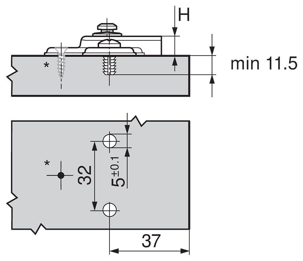 Plokštelė tvirtinama suEXPANDO (išsiplečiantys kaiščiai), paaukštinimas – 0mm, tipas – 37/32, reguliavimas – atpalaiduojant tvirtinimo varžtus. Tvirtinimas prie lanksto – MODUL (užveržiant varžtu).